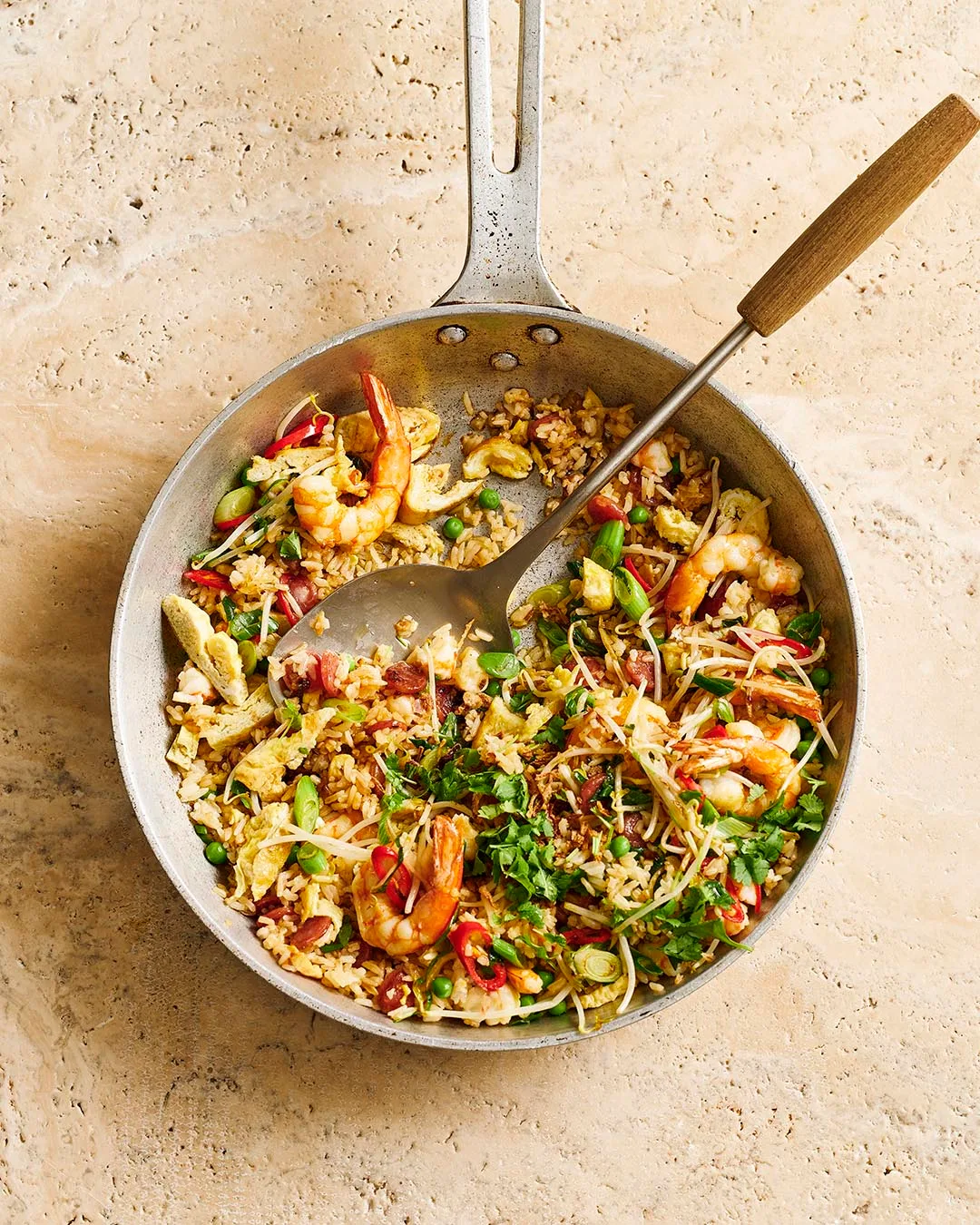This easy, special fried rice recipe takes under an hour to whip up! It’s an egg fried rice, packed with veggies, prawns and fragrant sauces and herbs.