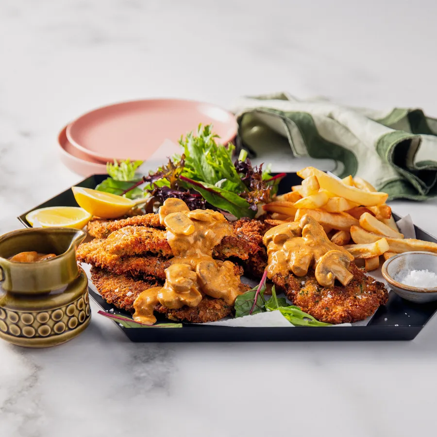 This pork schnitzel with creamy stroganoff sauce elevates a pub classic to bistro-worthy in minutes. Choose thin pork sizzle steaks or slightly flattened loin steaks for the best result, for even cooking inside the crunchy crumb.
