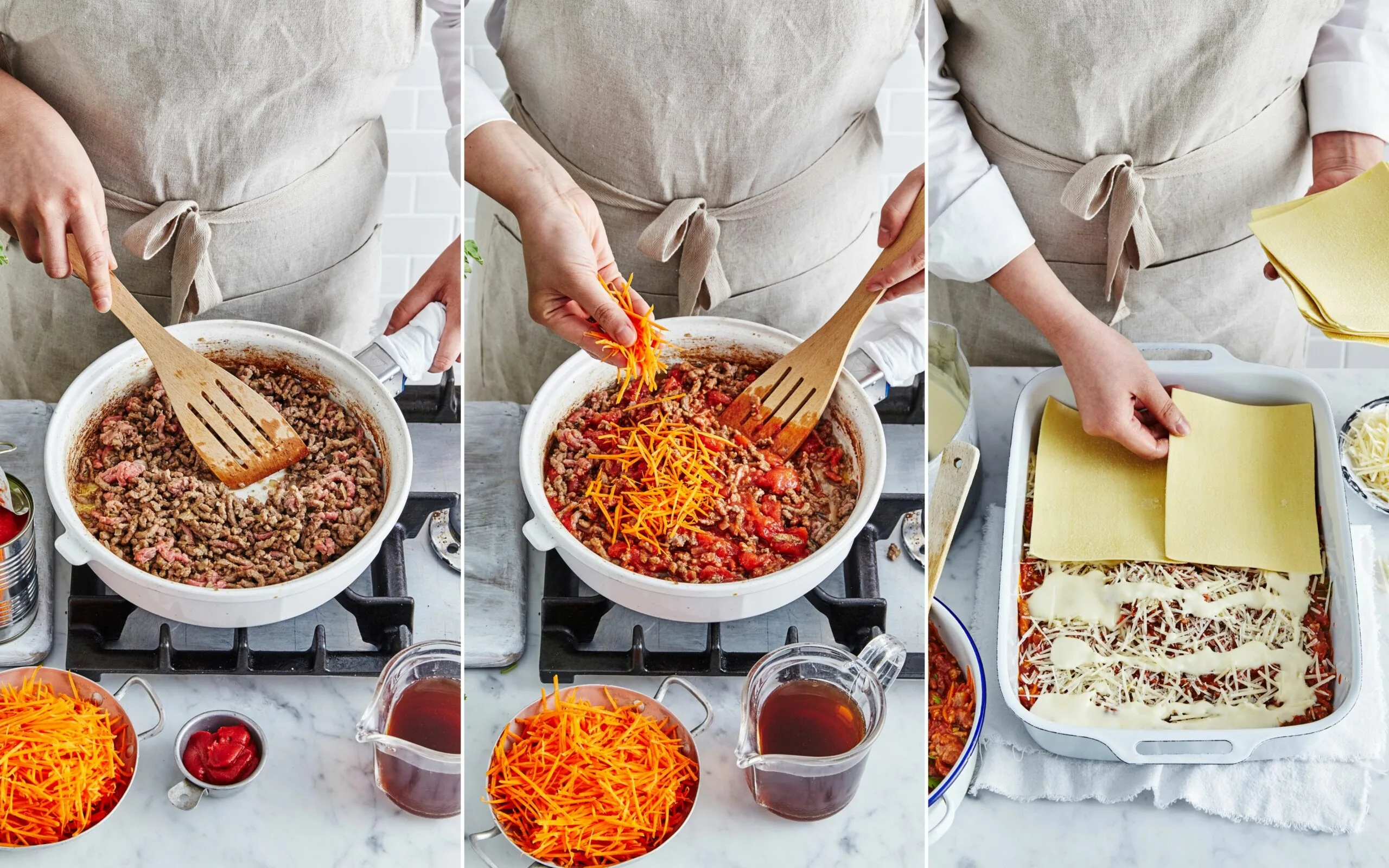 Spread ½ cup white sauce over base of the dish. Top with a layer of pasta sheets, a third of the bolognese sauce, ½ cup parmesan and 1 cup white sauce. Repeat layering two more times, starting with pasta sheets and ending with the remaining white sauce.