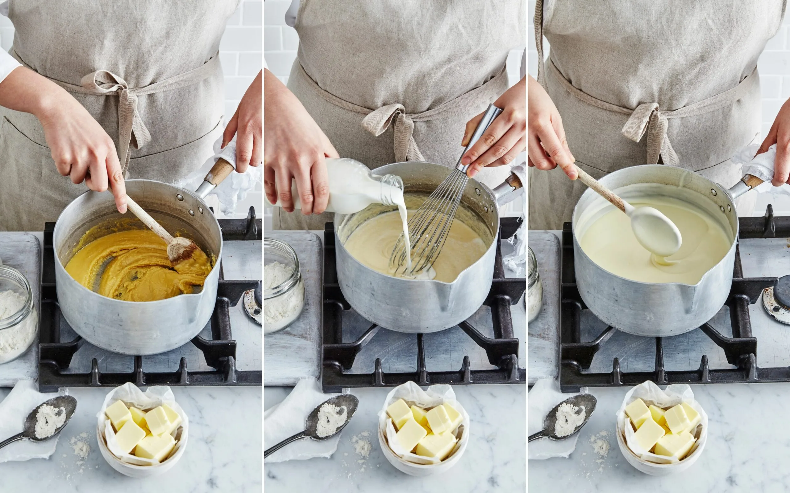 Melt the butter in a medium saucepan over low heat, so it keeps its colour and doesn’t brown. Sprinkle the flour over melted butter, then stir well with a wooden spoon until the butter is incorporated and the mixture forms a smooth paste (this is called a roux).